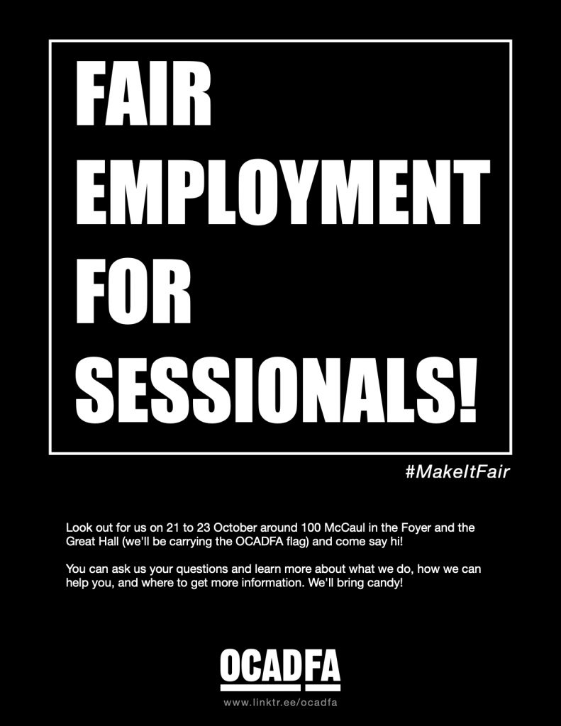 [For our members and students] Look out for us on 21 to 23 October around 100 McCaul in the Foyer and the Great Hall (we’ll be carrying the OCADFA flag) and come say hi! You can ask us your questions and learn more about what we do, how we can help you, and where to get more information. We’ll bring candy!
