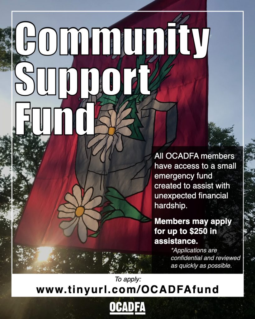 The OCADFA community support fund addresses situations where OCADFA members are experiencing a significant life event that places them in a position of economic, food, or housing insecurity.