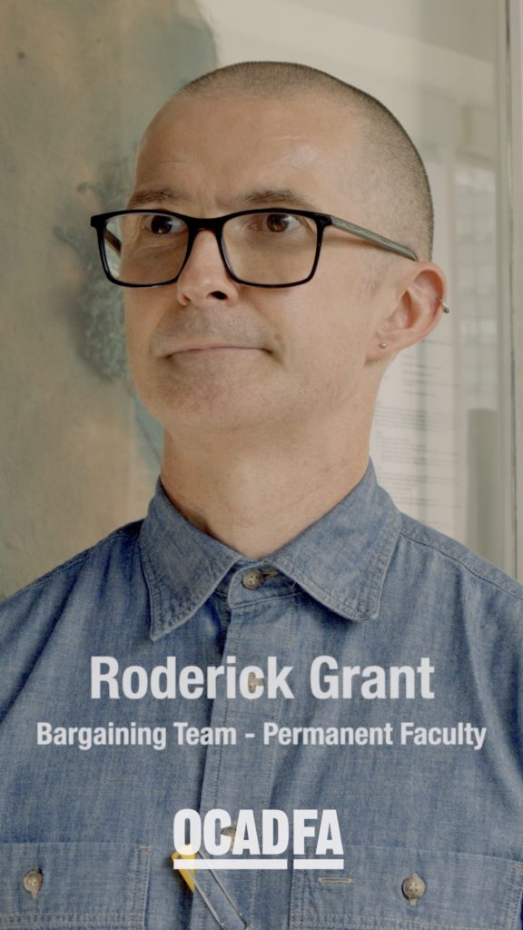 This series was shot this past spring by Alex Williams, a multiple award-winning’ documentary film-maker and OCADU sessional instructor, sound Recording by OCADFA board member and Grievance co-chair Gerald Grison, a multidisciplinary artist and Integrated Media Technician in Studio Services and supported by Integrated Media students Jane Qin and Paul Song.